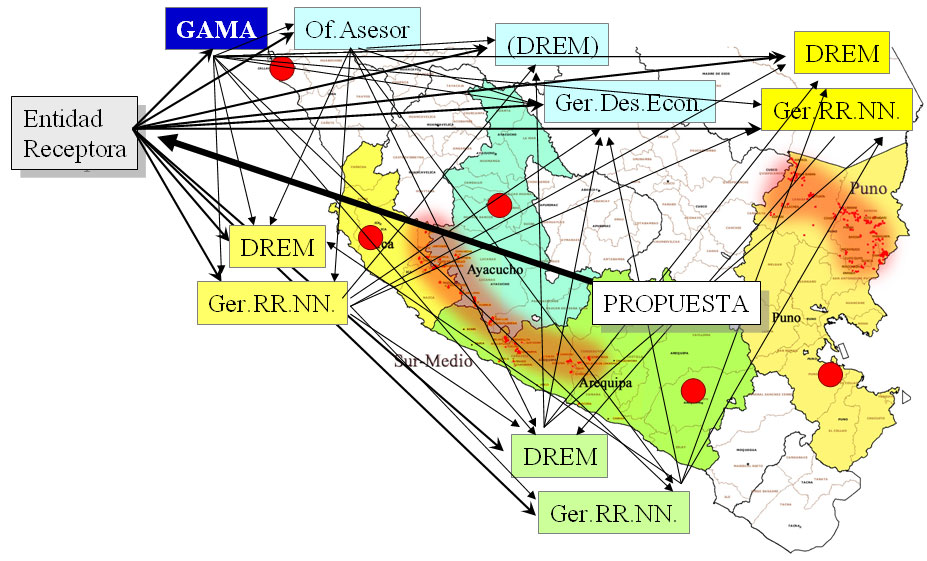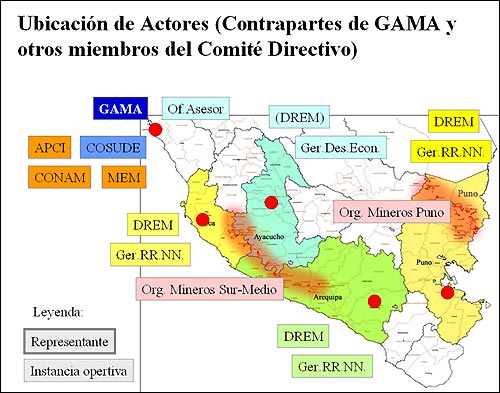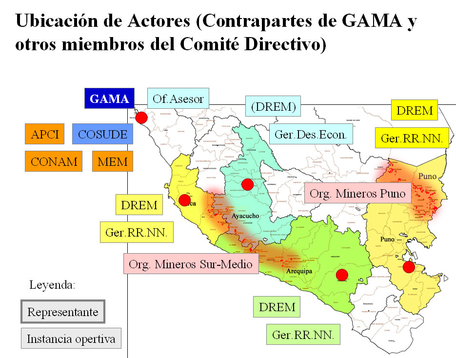 Asimismo, el Convenio subsidiario para la ejecución del proyecto incluyó otras instituciones, tales como la Agencia Peruana de Cooperación (APCI), el Consejo Nacional del Medio Ambiente (CONAM) y representantes de las organizaciones gremiales de los mineros artesanales de ambas zonas del proyecto (2 de Sur-Medio y 1 de Puno). La ilustración 1 indica la sede de las oficinas de cada una de las instituciones participantes en el proyecto GAMA.