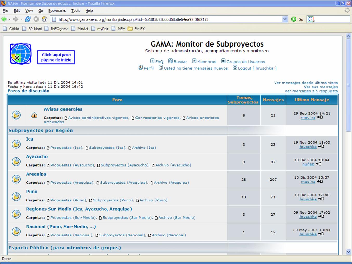 c) Tipo de software: Si bien existe una gran variedad de aplicaciones para Trabajo Colaborativo ("Groupware"), manejo de proyectos ("Project Management"), o para organizar flujos de trabajo entre multiples colaboradores ("Workflow Engines"), un análisis desde el punto de un "escenario zero" (¿cómo lo haríamos sin una aplicación web?) llevó a la conclusión, que el proceso del manejo de los subproyectos consiste principalmente en comunicación entre los participantes, la discusión de propuestas, informacion sobre decisiones a tomar y decisiones tomadas, y el intercambio de opiniones en el transcurso del monitoreo y la evaluación. Además es un proceso que requiere mucha flexibilidad y no se deja facilmente encasillar en un flujo de trabajo rígido. En resumidas cuentas: es una discusión sobre diferentes temas, siendo cada subproyecto un tema. Producto de esta conclusión era, que el mejor tipo de software será un software para un "Foro de Discusión".